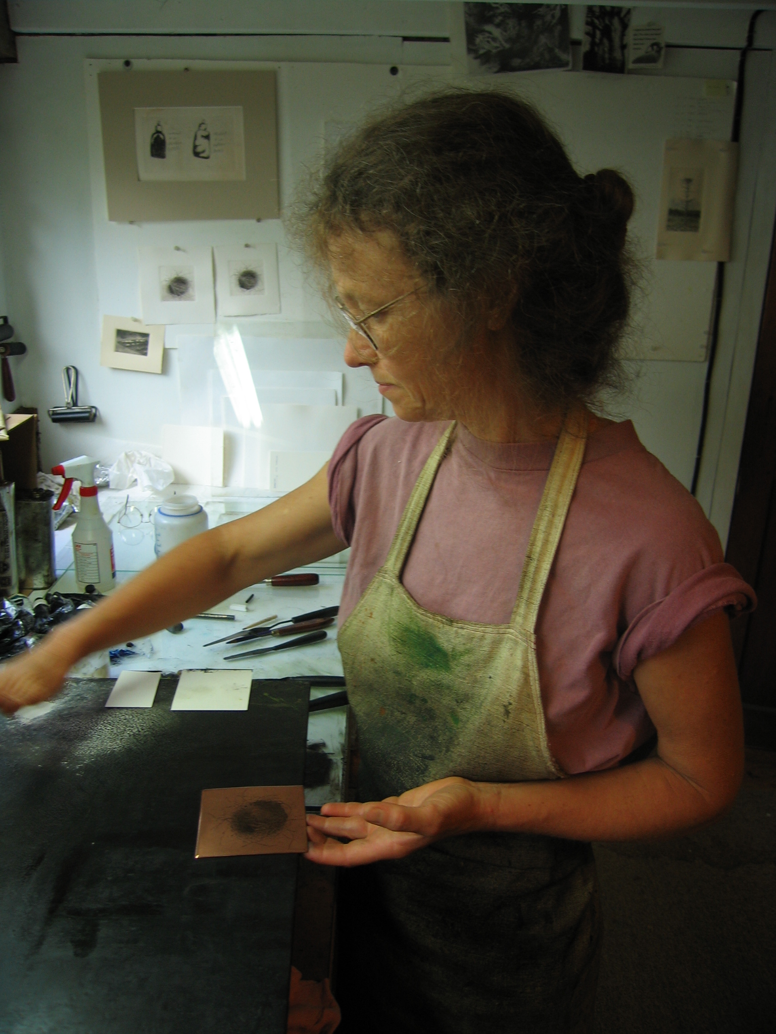 Primarily, she uses the medium of intaglio printmaking. Line etching involves drawing with a needle through a thin wax on a copper plate and this allows for the kind of detail she needs to explore the intricacies of her subjects. Aquatint, drypoint, and mezzotint are often incorporated and occasionally an image will call out for color and multiple plate processes.