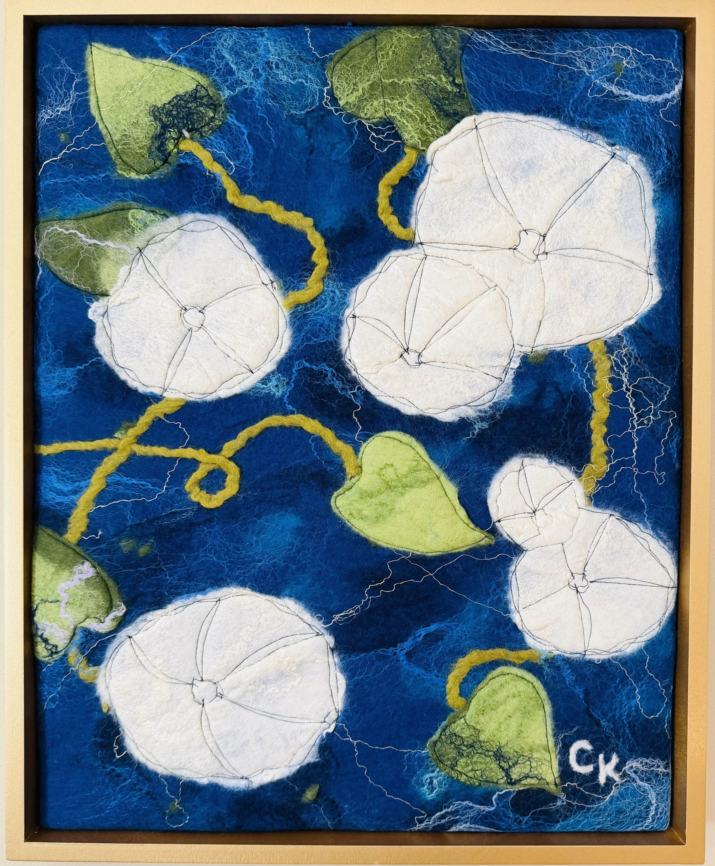 "Moonflowers", sheep wool, yarn, thread, 16" x 20", $300 (framed)