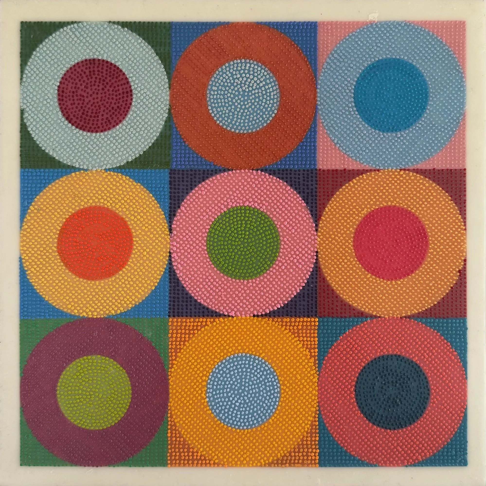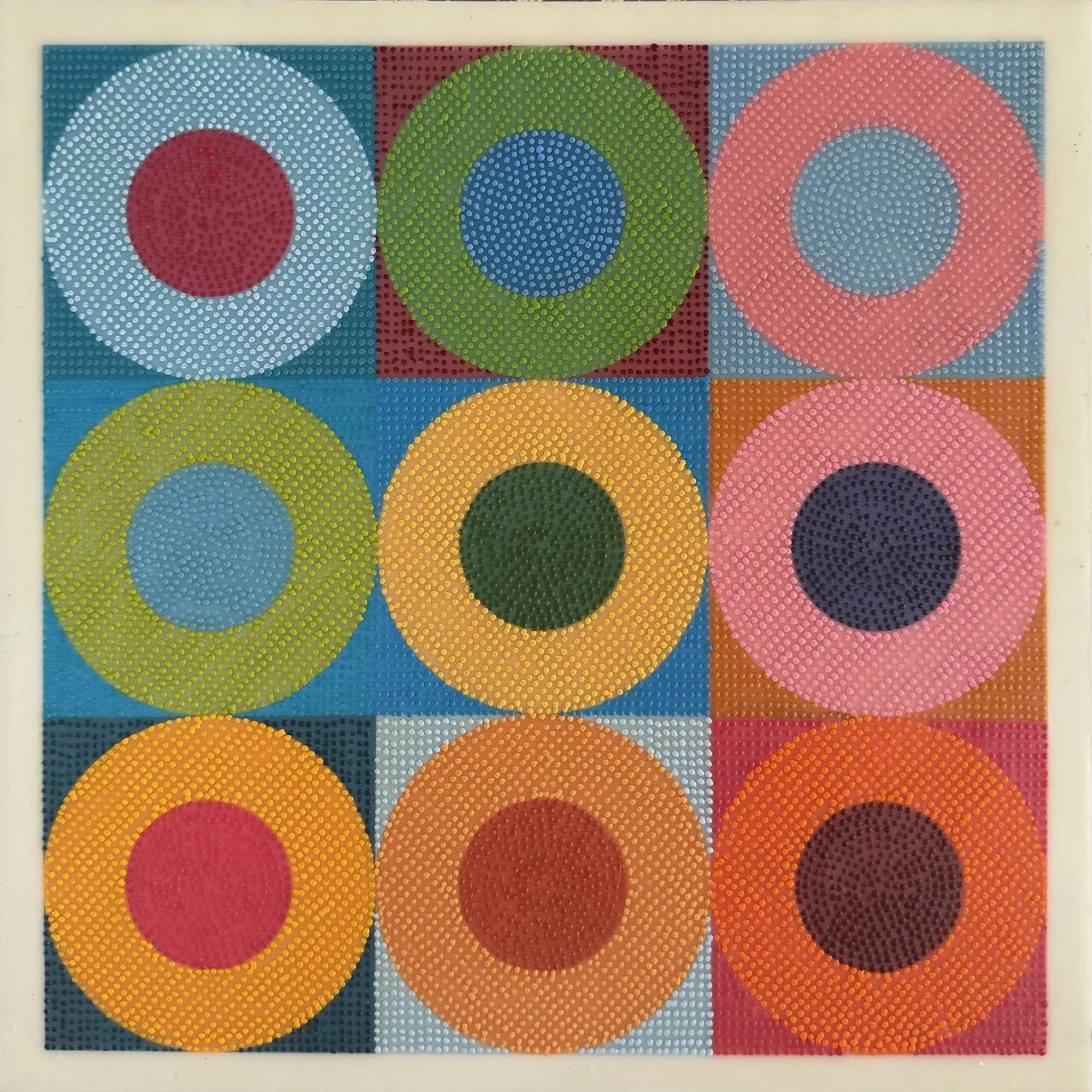 "Radiant Circles II", encaustic, 12" x 12", $550 (framed)