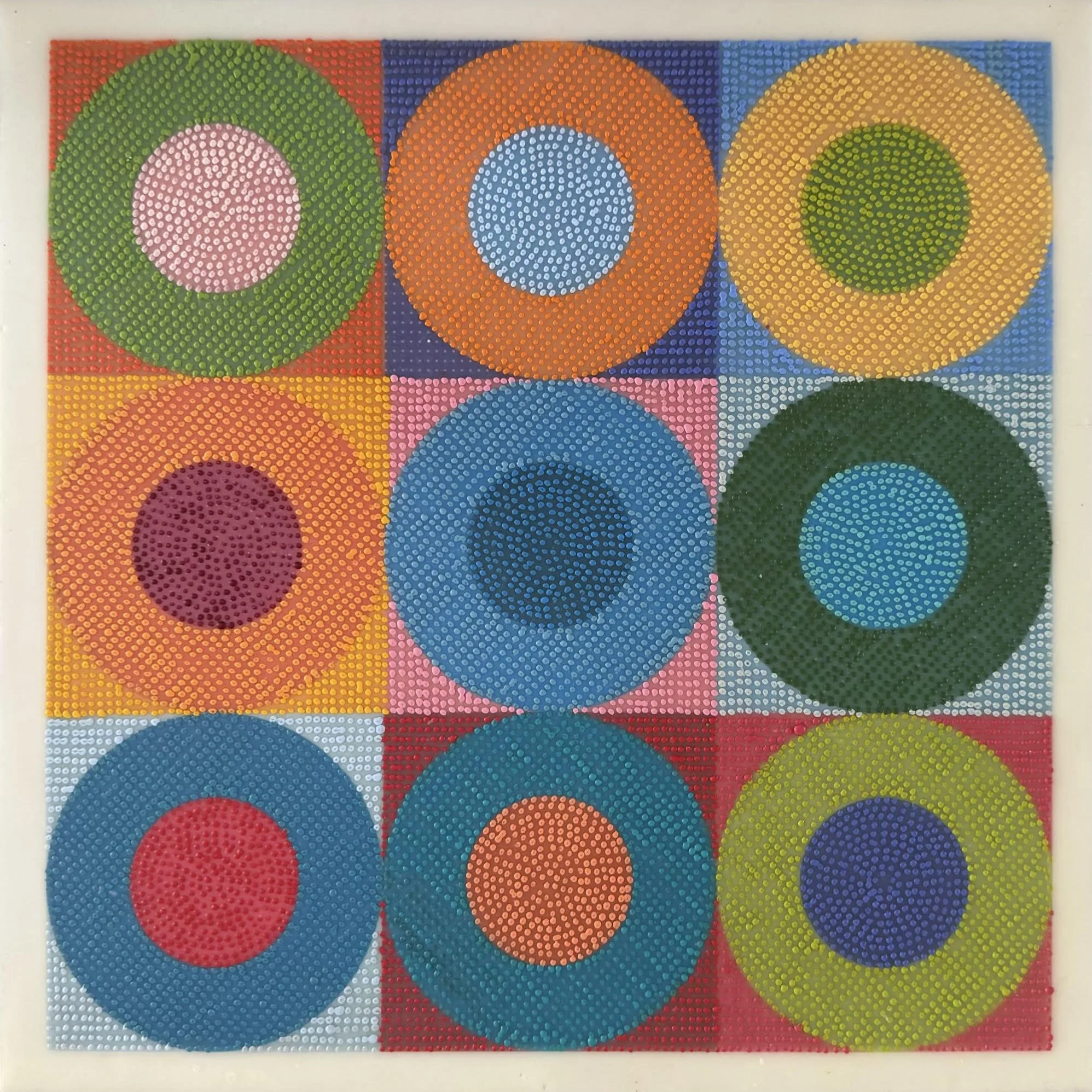 "Harmony In Circles & Squares : Dialogues In Color", encaustic, 24" x 24", $1,850 (framed)