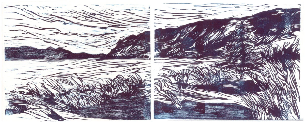 “I cut bold lines and rugged forms into my woodblocks. I print my woodcuts in one color to convey either stark stillness or intense movement in the landscape. My prints are monochromatic because I do not want the distraction of color to diffuse the forms. Conversely, my monotypes and etchings feature layers of translucent color, elusive light on surfaces, and undulating lines. Both woodblock etching and monotype reveal my strong interest in the variety of changing textures and patterns in nature. I am constantly trying new techniques, inks, and tools to discover more ways of expressing myself through printmaking.