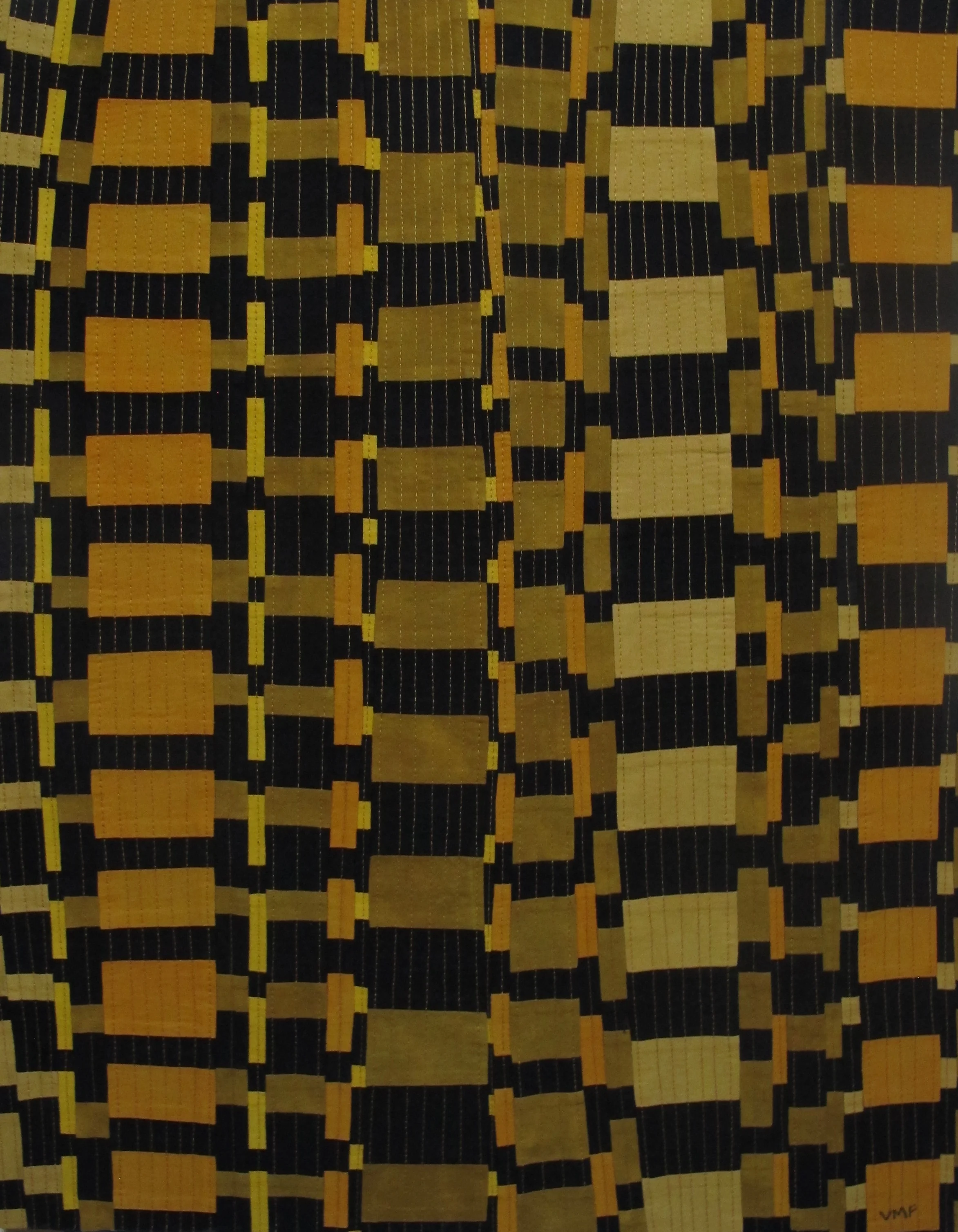 “My fabric compositions use improvisational piecing of hand dyed fabric with intentional machine stitching to create bold, abstract designs with strong figure ground components. I am inspired and influenced by lines and shapes observed in nature, architecture and ethnic design. The compositions are created from initial views of design forms juxtaposed with a color palette. I hand dye cloth using three primary hues, mixed in various proportions, to create colors ranging from subtle neutrals to vibrant hues. Line and shape, critical elements in the process, are used to create movement and tension in my compositions. They are hand cut without a ruler, using a razor sharp tool as a drawing device. I use the final stitching lines as drawing lines to further define and enhance my composition.”